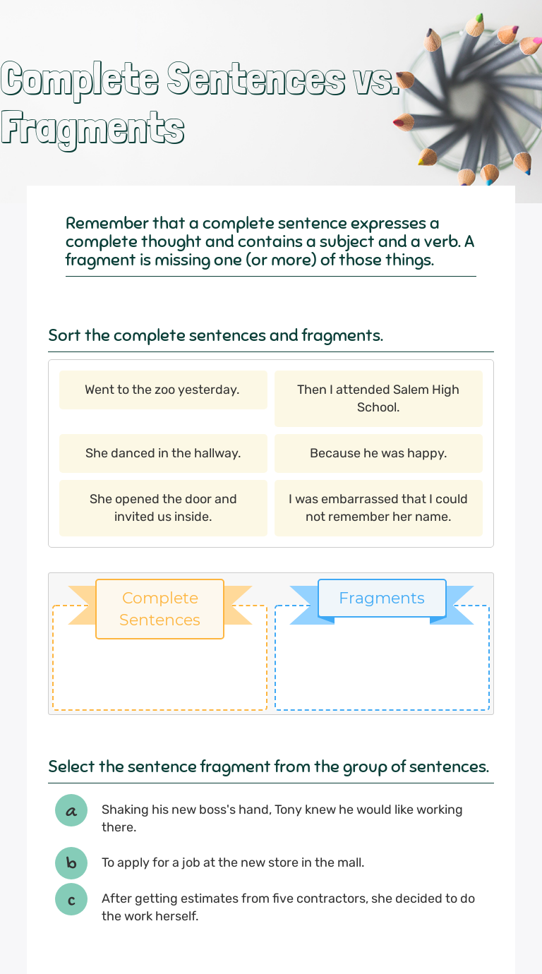 Fragments And Sentences Worksheets - DSoftSchools Some of the worksheets below are Fragments And Sentences Worksheets, 5 common types of sentence fragments, two ways to correct a fragment, finding and fixing fragments in your own writing with several interesting exercises with answers. Once you find your worksheet (s), you can either click on the pop-out icon or download button to print or ... Sentence Fragments Worksheets Worksheet Answer Keys Find the Fragments A sentence fragment is either missing a subject, missing a predicate, or does not express a complete thought. Decide whether each set of words is a sentence or a fragment. Worksheet Answer Keys Fix It Up! Revise each fragment so that it is a complete sentence. Worksheet Answer Keys Find Them