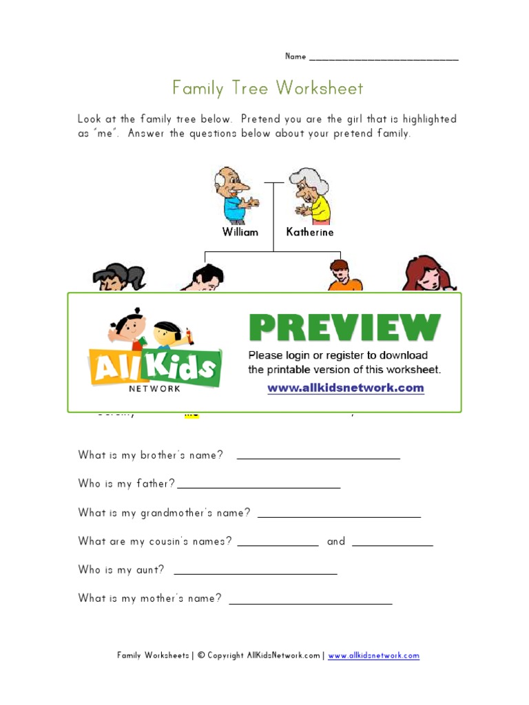 PDF Family Tree Worksheet - All Kids Network Family Tree Worksheet Author: AllKidsNetwork.com Subject: Family tree worksheet for kids. Look at the family tree below. Pretend you are the girl that is highlighted as "me". Answer the questions below about your pretend family. Keywords: family tree worksheet, kids family tree Created Date: 1/12/2011 9:23:41 PM