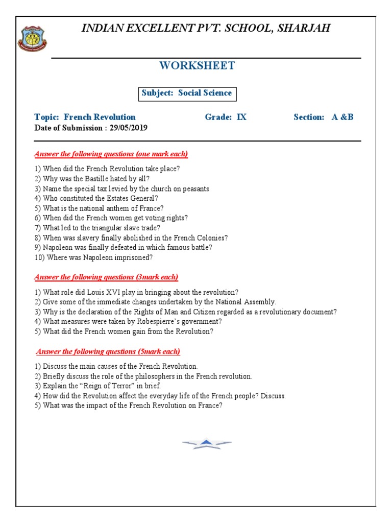 CBSE Class 9 History French Revolution Worksheet Practice ... French Revolution Class 9 History Worksheet Pdf. Class 9 History students should refer to the following printable worksheet in Pdf for French Revolution in standard 9. This test paper with questions and answers for Grade 9 History will be very useful for exams and help you to score good marks.