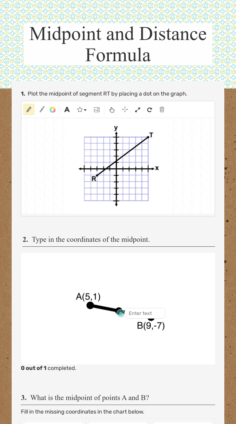 Distance and mid-point formula practice worksheet Measurement online worksheet for 8. You can do the exercises online or download the worksheet as pdf. All worksheets Only my followed users Only my favourite worksheets Only my own worksheets. Midpoint-Distance Worksheet | PDF | Euclid | Triangle Midpoint-Distance Worksheet. Original Title The quadratic formula, tells you the solutions of a quadratic equation in the form ax 2 +bx +c=0 . The midpoint of a segment is the point that divides the segment into two congruent pieces. Distance and midpoint formula worksheet pdf The Midpoint Formula is Midpoint = a + s 2 + ˘ b + t 2 i. 1 Midpoint worksheet . Midpoint and distance formula zombie worksheet answer key Midpoint And Distance Formula Worksheet With Answers onlinekwcedu Author. Problems include finding the midpoint given both endpoints, and... Midpoint Formula Worksheets Equipping students with our free printable midpoint formula worksheets equates to providing them access to the most valuable practice tools. Whether it is the application of the midpoint formula, or using the number line model to determine the midpoint, or finding the missing coordinates using the...