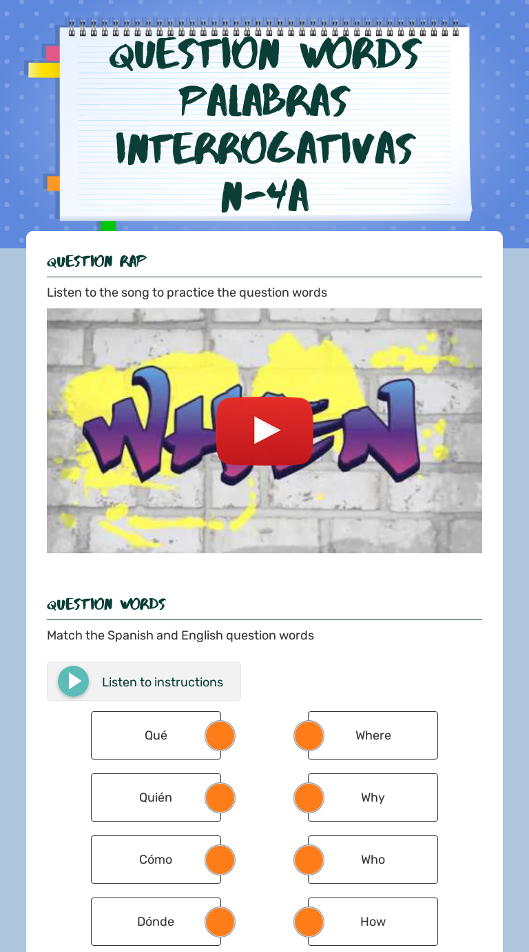 Spanish question words worksheet. Spanish Question Words Worksheet Economic Spanish Questions Words Worksheets & Teaching Resources TpT. Economy. Details: Los Interrogativos (Question Words in Spanish) A variety of worksheets to practice question words in Spanish (los interrogativos). Worksheet 1: The first worksheet is to work on the difference between... Spanish Question Words Worksheet Spanish Question Words Worksheet help, worksheets and lessons for everybody including kids, schools, teachers, tourists and people living in Spain. Asking Questions in Spanish | SpanishDict | Spanish Question Words Learn about Spanish interrogative sentences, Spanish interrogative words, and how to ask simple questions in Spanish with this article. When asking information questions (questions that require an answer beyond sà or no), you'll need to begin your question with a question word. Spanish vocabulary and grammar lists by theme Question words in Spanish Question words in Spanish. Expressions followed by the indicative Expresiones seguidas de indicativo. Connecting words - comparing and contrasting ideas These Spanish connecting words are useful when you want to compare and contrast different ideas.