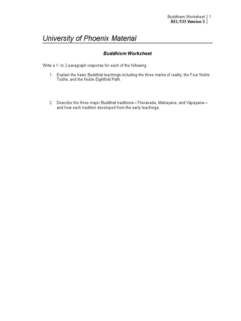 REL 133 UOP Course Tutorial, REL 133 Complete Course, REL ... REL 133 Week 1 Individual Assignment Elements of Religious Traditions Paper. Individual Assignment: Elements of Religious Traditions Paper. Write a 700- to 1,050-word paper that does the following: Describes these basic components of religious traditions and their relationship to the sacred: What a religious tradition says—its teachings ... (Get Answer) - Buddhism WorksheetREL/133 Version ... Buddhism WorksheetREL/133 Version 4University of Phoenix MaterialBuddhism WorksheetWrite a 1- to 2-paragraph response for each of the following.1. Explain the basic Buddhist teachings including the three marks of reality, the Four Noble Truths,and the Noble Eightfold Path.2. DOC UPX Material - myresource.phoenix.edu Explain the basic Buddhist teachings, including the three marks of reality, the Four Noble Truths, and the Noble Eightfold Path. Describe the three major Buddhist traditions—Theravada, Mahayana, and Vajrayana—and how each tradition developed from the early teachings. Buddhism Worksheet. REL/133 Version 6 1