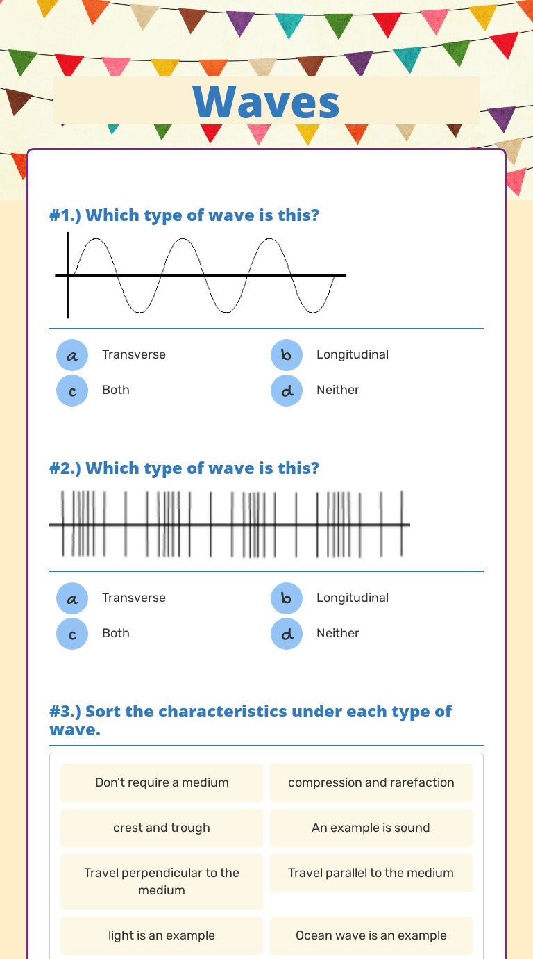 Waves Worksheets Teaching Resources - Teachers Pay Teachers This waves worksheet is a review of the basic properties of transverse waves.In this activity, students will:MEASURE the frequency, wavelength, amplitude, and speed of 6 transverse waves.DRAW a transverse wave based on provided information.ANSWER analysis questions.