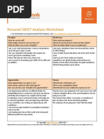 Personal SWOT Analysis - Mind Tools A personal SWOT analysis can help you to achieve your goals, make the most of your talents, and recognize new opportunities. SWOT stands for Strengths, Weaknesses, Opportunities and Threats. 3 2 1 1. Identify Your Strengths What are you really good at? Which achievements are you most proud of? What skills do other people compliment you on? 2. Consider Your … PDF Date: Week 2: Understanding Your Strengths Date: January 12, 2021 Your Name: Stuart Dent Directions: Understanding your strengths (S), weaknesses (W), opportunities (O), and threats (T) is crucial to your personal growth.Identify yours by completing the four quadrants of this Personal SWOT Analysis worksheet. Use bullets for each item in the quadrants; you can use phrases or