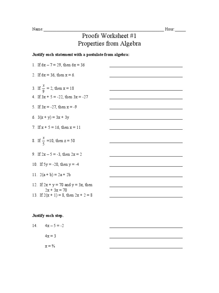 Geometry algebraic proofs worksheet. Creative Geometry Proofs Worksheets With Answers - Labelco Some of the worksheets for this concept are Geometric proofs work and answers Geometry work beginning proofs Geometry beginning. Postulates and Paragraph Proofs. All students should answer questions 3 and 4 that accompany the experiment and you should. Geometric proofs worksheets check everything. Algebraic Proofs In Geometry Worksheet * That Algebraic Proofs In Geometry Worksheet the services you provide are meant to assist the buyer by providing a guideline. * That Algebraic Proofs In Geometry Worksheet the product provided is intended to be used for research or study purposes only. Algebraic Proofs Worksheet - Studying Worksheets Algebraic proofs involve constructing an algebraic expression to match the statement then proving or disproving the statement with this expression. 5 l 6fvtvx X 10 2 41 x 2. Algebraic Proof Solve each equation. So you can use these same properties of equality to write algebraic proofs in geometry. Algebraic proofs worksheet answers gina wilson. PDF Wpmu Dev Glencoe Geometry Write a two-column proof to verify the conjecture. 7. IfÃQ QS and QŠ then PQ ST. 2. Chapter 2 S 25 . Name: WORKSHEET: Algebraic Proof Solve each equation. Write a reason for every step. 4x = + 32 32 2.) 32 + 153 = + 51 PfbP. 28 + = PYðP- -5x + 18 + 5xttg a)