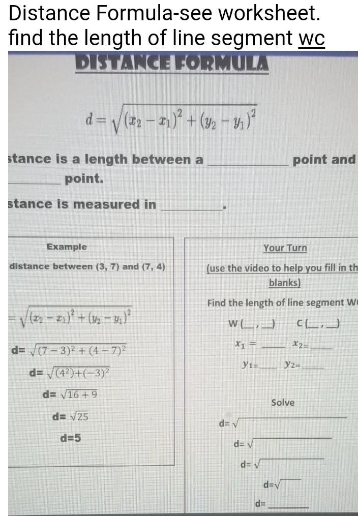 Distance Formula (video lessons, examples, solutions) Using the distance formula: Distance = = 5.66 (correct to 2 decimal places) Distance Worksheet 1, Distance Worksheet 2 to calculate the distance between two points. How The Distance Formula Comes From The Pythagorean Theorem? Example of finding the distance between two points. Show Video Lesson Distance Formula Worksheets - Tutoringhour.com Our printable distance formula worksheets provide adequate practice in substituting the x-y coordinates in the formula: d = √ ( (x 2 - x 1) 2 + (y 2 - y 1) 2) to find the distance. Finding the Length of the Side | Shapes