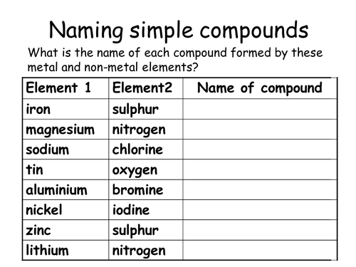 PDF Elements and Compounds Worksheet - Weebly Chemistry 11 Elements and Compounds Worksheet Assignment 1. Fill in the blanks in the following chart. Element Name Element Symbol Common Ions Formed a. Sodium Na +1 b. Copper Cu +2, +1 c. Tungsten W +6 d. Iron Fe +3, +2 e. Tin Sn +4, +2 f. Potassium K +1 g. Gold Au +3, +1 h. Silver Ag +1 2.