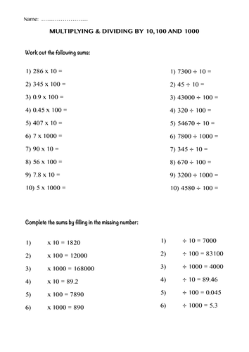 👉 Multiplying and Dividing by 10, 100 and 1000 Activity ... Teach students how to multiply and divide by 10, 100 and 1000. This activity booklet includes all that Y5 students and above need to practice multiplying and dividing by 10, 100 and 1000. The booklet includes a helpful poster full of number facts and top tips, plus a wide range of activities to help children master this essential skill.