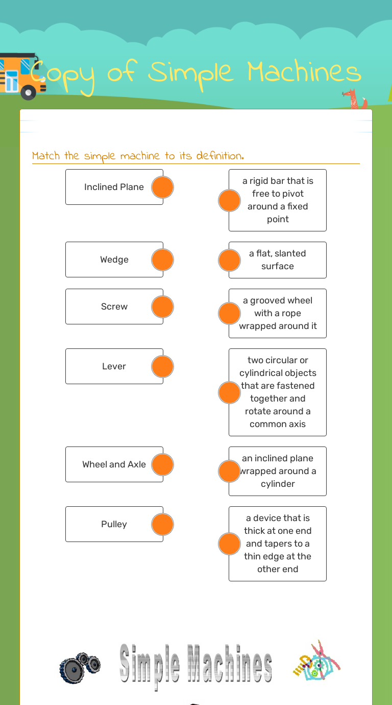 Simple Machines Worksheet - Answers - Teach Engineering Engineering: Simple Machines Lesson Simple Machines Worksheet - Answers 1. Match the simple machine with its correct definition by writing the corresponding number in the answer column. Simple Machines Answer Definitions Lever = 5 1. Something that reduces the friction of moving something. Inclined plane = 3 2. Something that can hold things ...