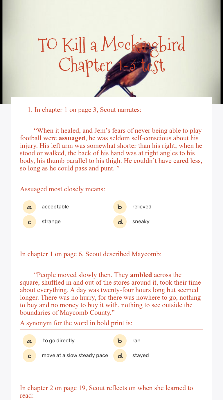 To kill a mockingbird worksheet. How to Create a Powerful Character Arc (Worksheet Included) Page-turning novels feature memorable characters. Consider: Gone With The Wind by Margaret Mitchell; The Old Man and the Sea by Ernest Hemingway; The Sherlock Holmes novels by Arthur C. Doyle; To Kill a Mockingbird by Harper Lee; Anne of Green Gables by L.M. Montgomery; The Wonderful Wizard of Oz by L. Frank Baum; Anna Karenina by Leo Tolstoy; All spotlight lead … Home | Library of Congress Gender Prejudice in To Kill a Mockingbird: Examples & Quotes Nov 30, 2021 · Harper Lee puts the role of women and gender prejudice front and center in To Kill a Mockingbird, her novel set in the 1930s in Maycomb, Alabama.Gender prejudice is discriminating against people ... Counterargument Examples - Softschools.com 1. Littering: It seems like an easy argument to be against littering, but many can also use the counterargument stating littering results in the creation of jobs. People get paid to clean up the litter.