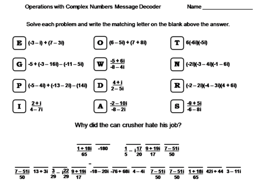 Complex Numbers Worksheets (pdfs) - Mathwarehouse.com Each worksheet has model problems worked out step by step, practice problems, as well as challenge questions at the sheets end. Plus each one comes with an answer key. Simplify Imaginary Numbers Adding and Subtracting Complex Numbers Multiplying Complex Numbers Dividing Complex Numbers Dividing Complex Number (advanced) End of Unit, Review Sheet